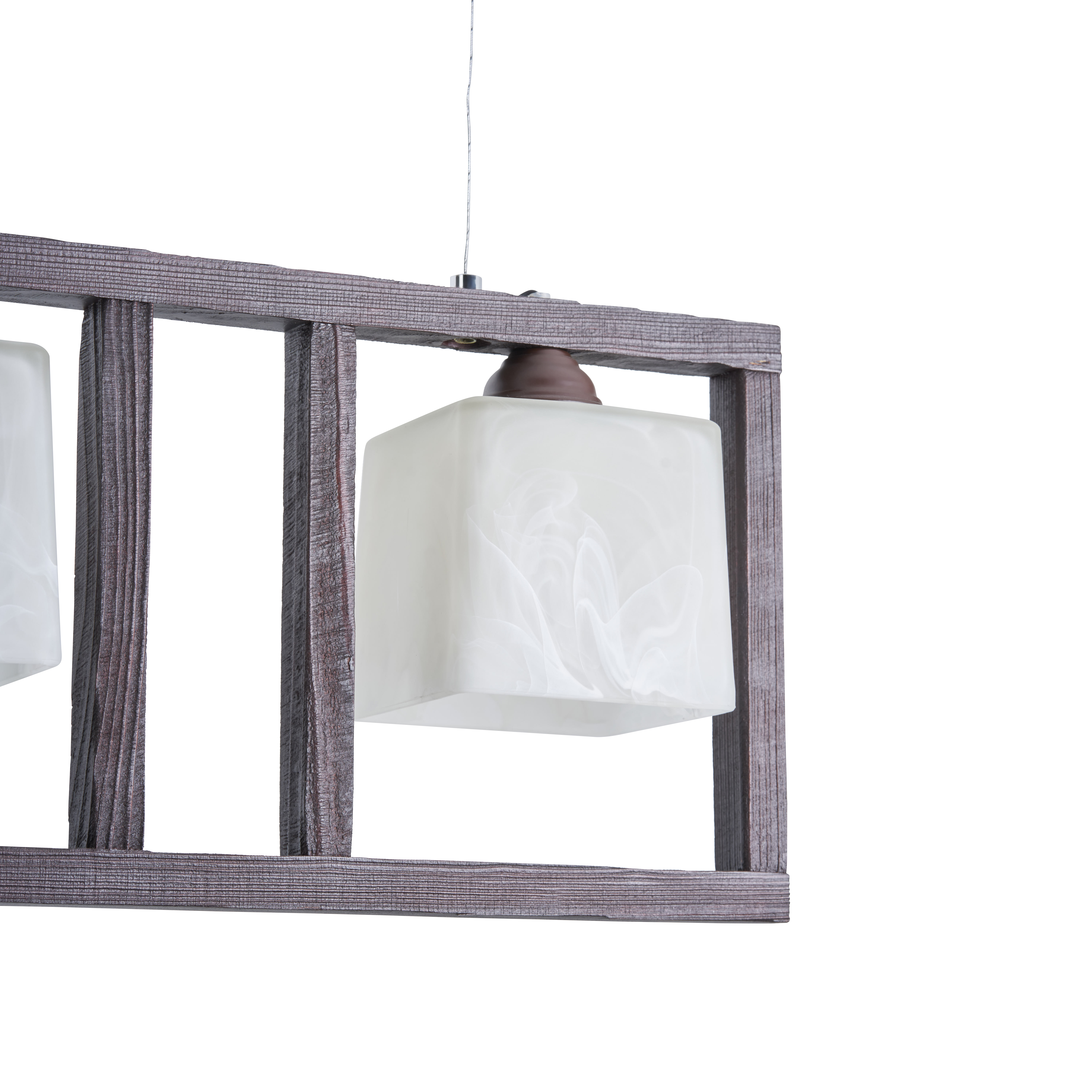 Люстра состоит из двух квадратных абажуров, выполненных из матового стекла. Они крепятся к основанию с помощью двух металлических рожков. Основание люстры изготовлено из металла и имеет геометрическую форму. Оно окрашено в цвет венге, который идеально сочетается с любым интерьером.